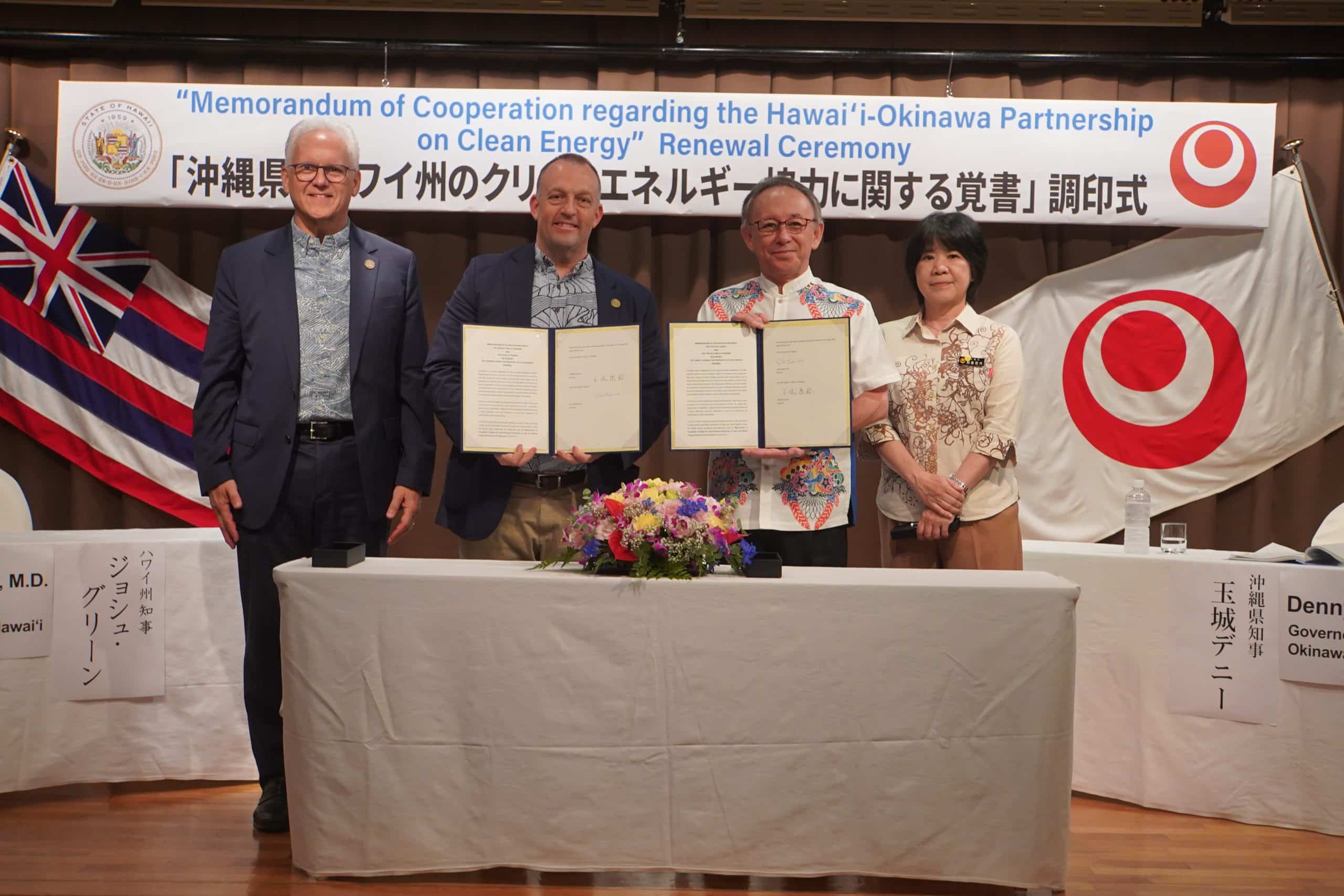 Governor Green and Okinawa Governor Tamaki, along with their Chief Energy Officers, pose for a photo with the signed memorandums.